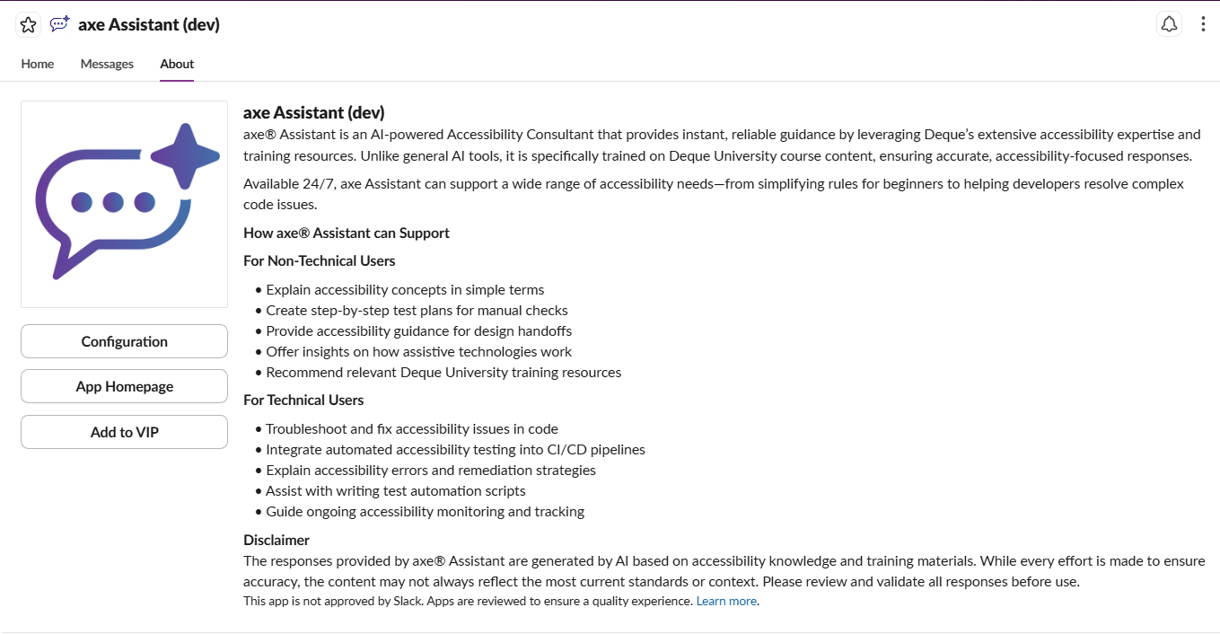 The About section provides a quick summary of what is axe Assistant.