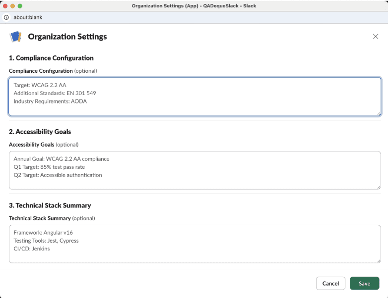- Click Save. The entered data is saved in the axe Assistant chatbot.