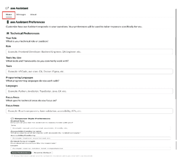 Click Save Preferences. The entered data is saved in the axe Assistant chatbot. If you want to go back to default settings, click Reset to Default.