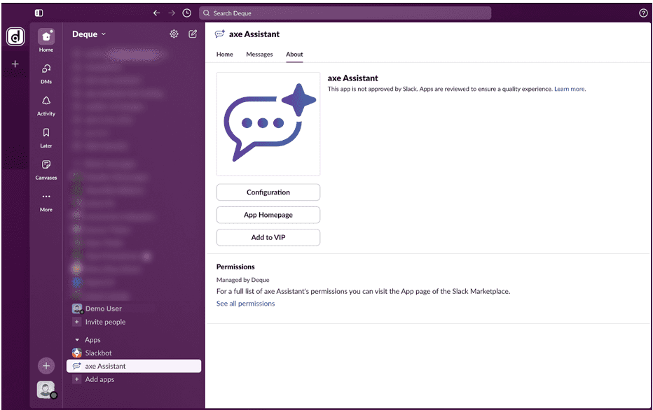 - On the Slack application, under Apps, click axe Assistant. The axe Assistant home page is displayed.