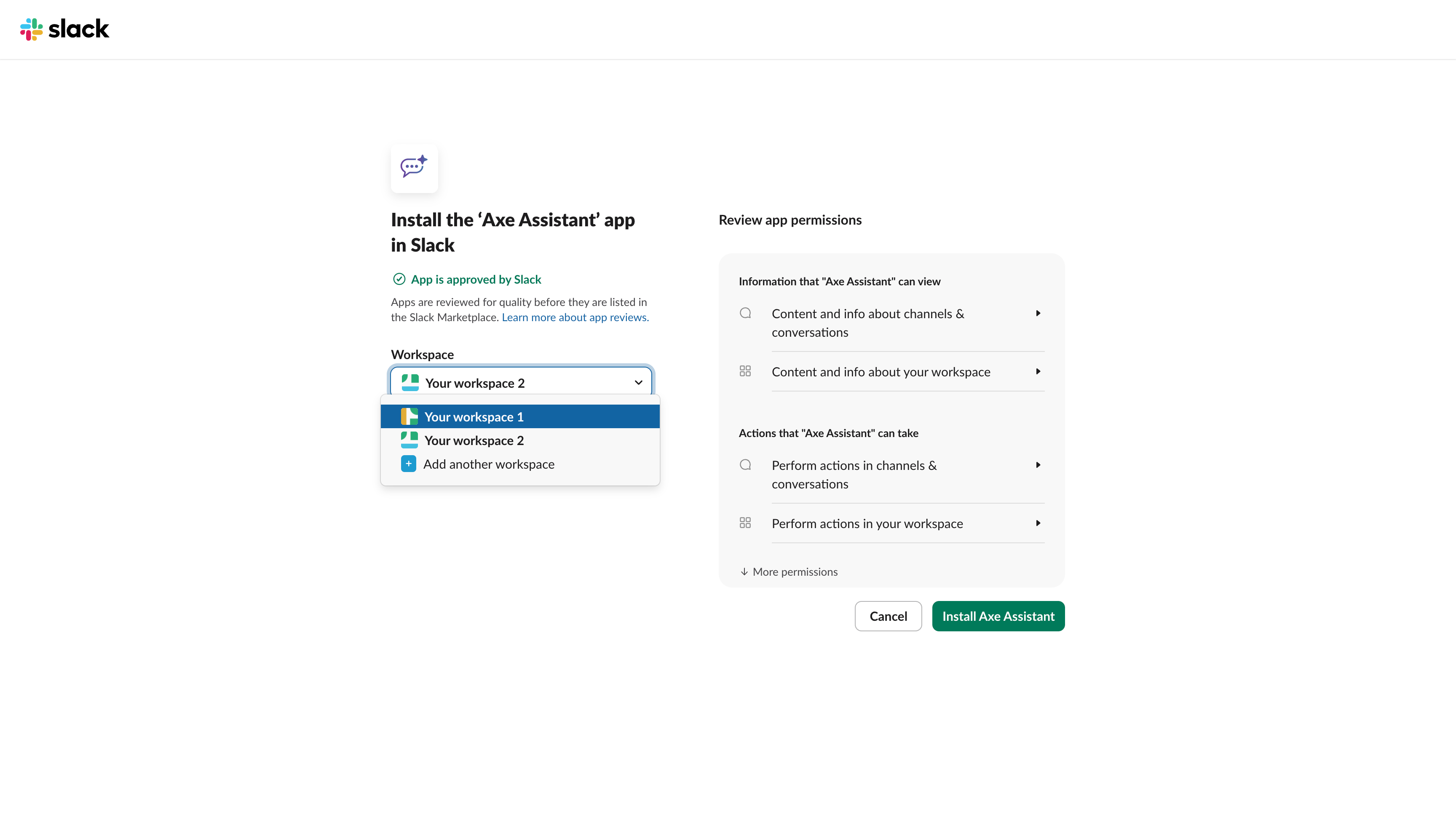 - A Slack workspace where you want to install Axe Assistant.
