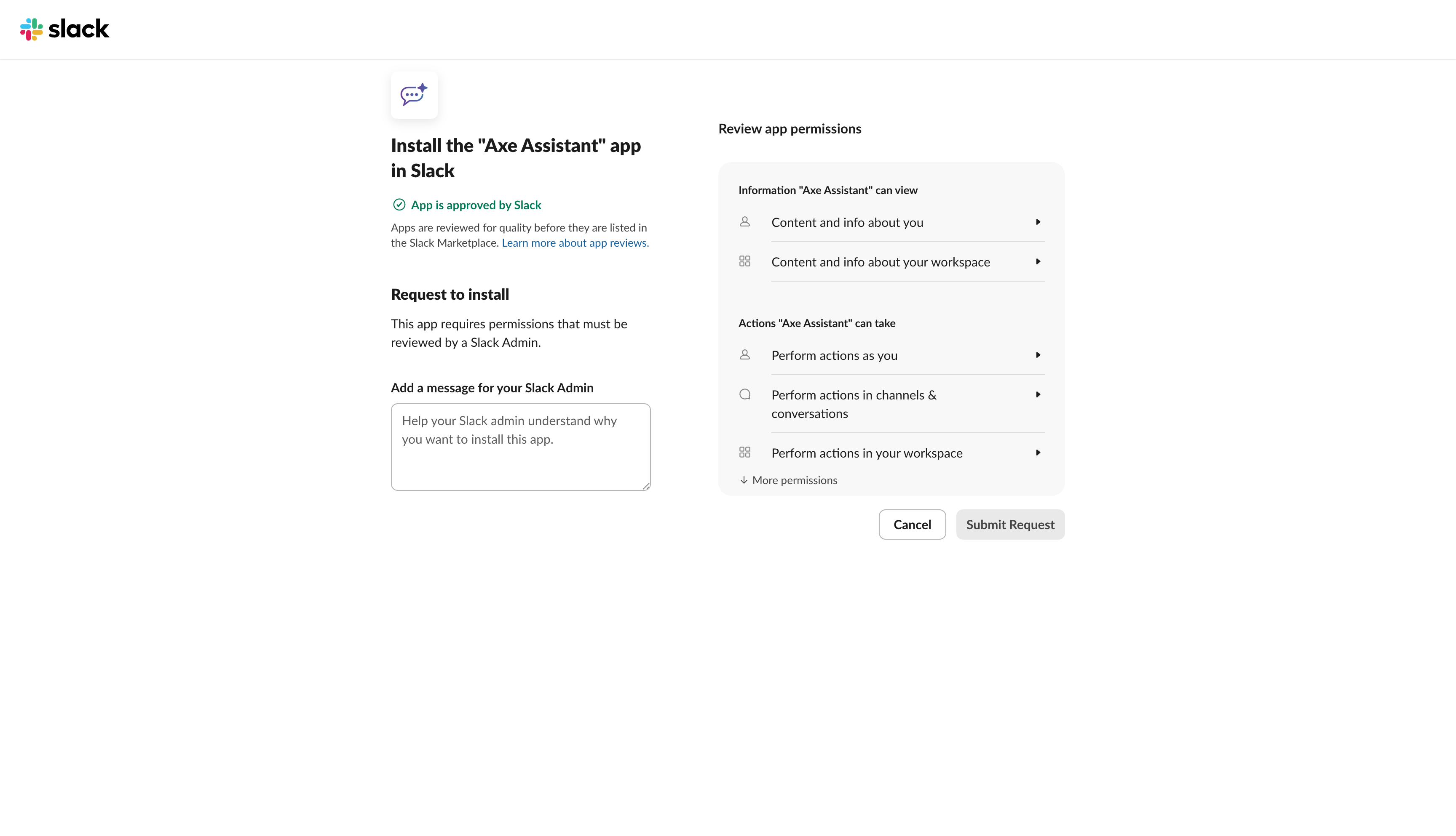 Slack administrators can install the Axe Assistant app without submitting the installation request.