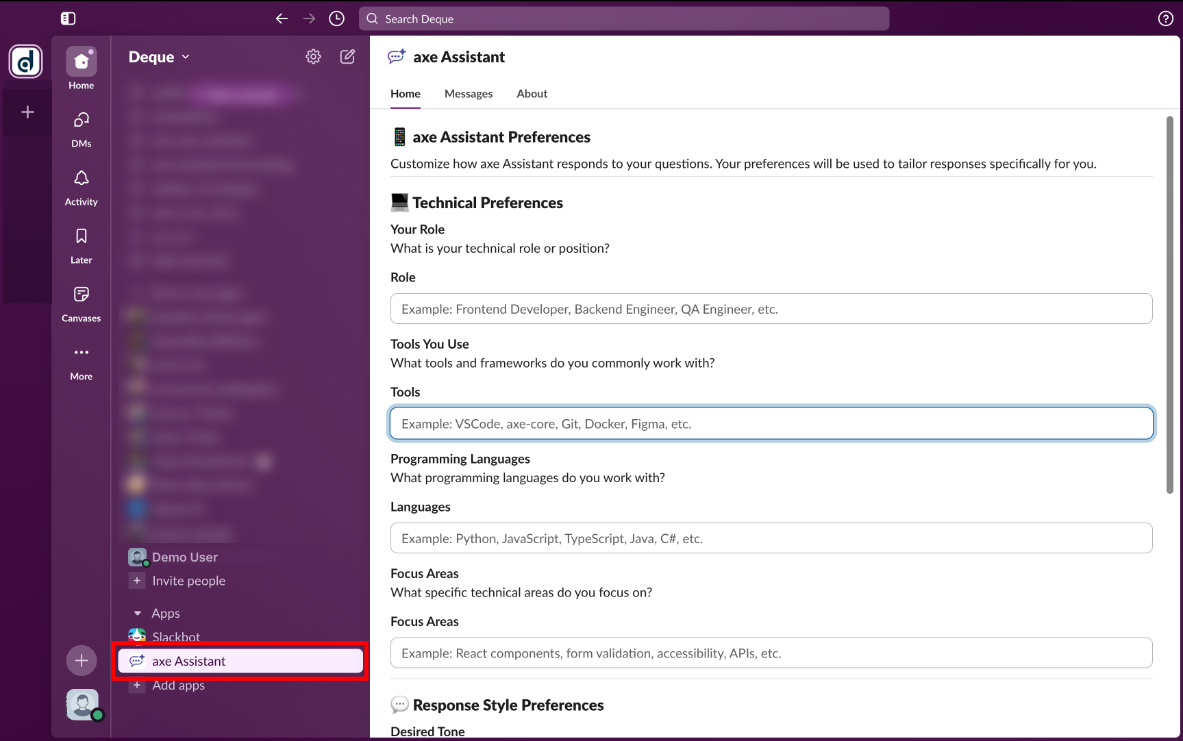 - Direct Message: Start a private conversation with Axe Assistant for one-on-one accessibility guidance.