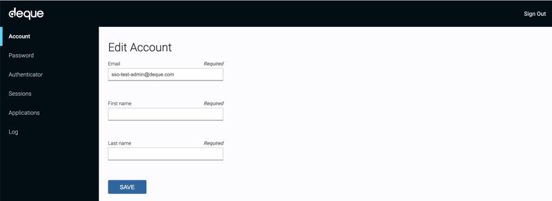 - E-Mail: Erforderlich und bearbeitbar. Obwohl dieses Feld bearbeitet werden kann, sollte die E-Mail-Adresse auf diesem Bildschirm nicht aktualisiert werden. Um die E-Mail-Adresse zu ändern, wenden Sie sich bitte an den Deque-Helpdesk.