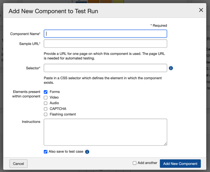 A blue button at the top, right of either the Components or Pages panel provides a way to add new to the test run (and optionally, to the associated test case).