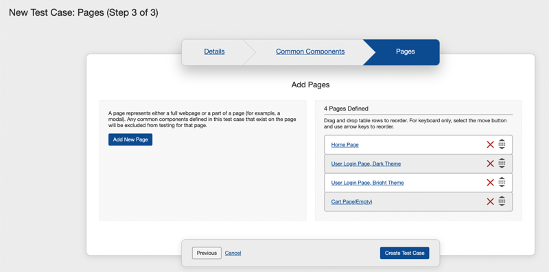 Es necesario agregar al menos una página a un caso de prueba para crear un nuevo caso de prueba. Una página representa la página individual o el contenido único específico de una página dentro de un caso de prueba cuya accesibilidad desea probar. Puede ser una página web completa o parte de una página (por ejemplo, un modal). Cualquier componente común definido dentro de un caso de prueba que exista en una página específica no se probará como parte de la prueba de esa página. Actualmente, el requisito mínimo es 1 página, y aunque técnicamente no hay un número máximo de páginas permitidas, recomendamos no agregar más de 30 para garantizar la eficiencia.