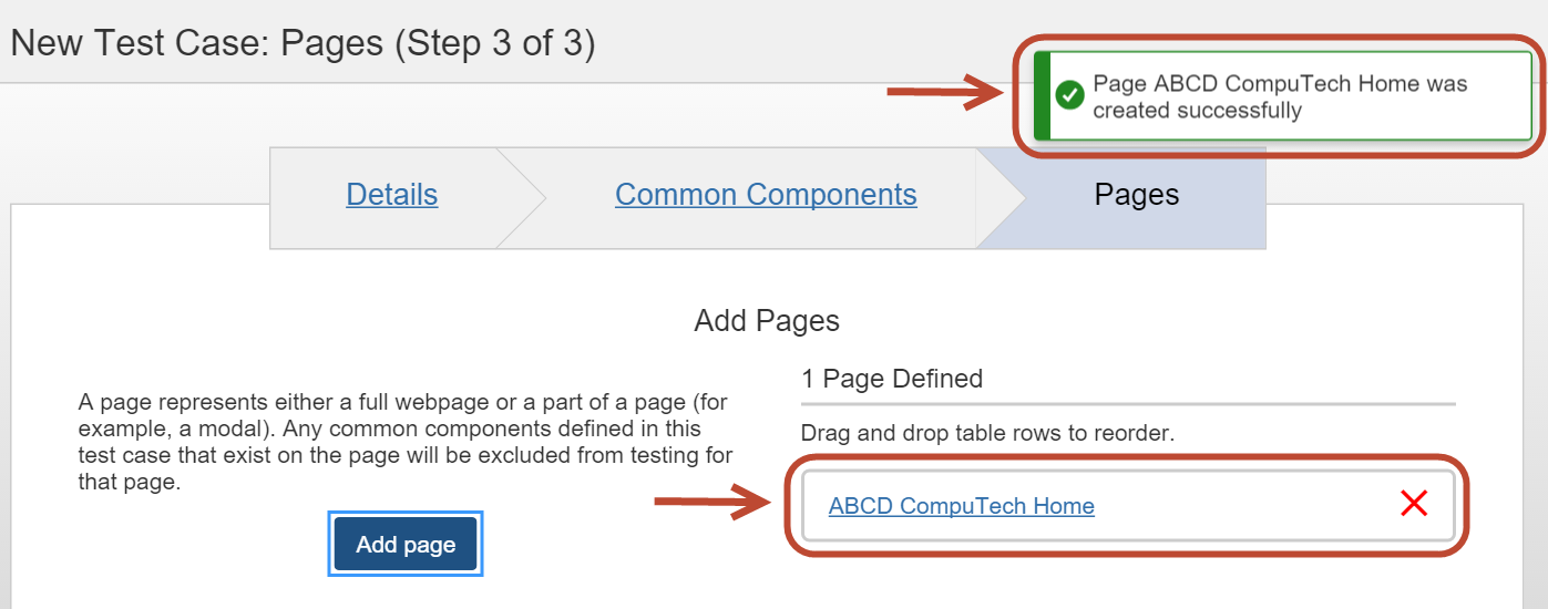 Después de agregar, el cuadro de diálogo Agregar página se cierra y la pantalla Nuevo caso de prueba: Páginas (Paso 3 de 3) muestra un mensaje de 'página creada exitosamente' en la parte superior derecha, y cada página que agrega aparece como un elemento en la sección Páginas definidas del panel Páginas con un enlace Nombre de página que le permite editar la página en el cuadro de diálogo Editar página y un ícono X rojo que le permite eliminar la página.