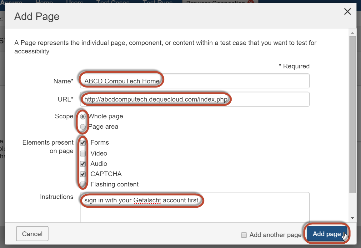 - En el campo Instrucciones , escriba cualquier texto de nota instructiva relevante para la página, el componente o el contenido que se va a probar. Este es el campo apropiado donde se deben registrar los datos de inicio de sesión necesarios para acceder a la página que se va a probar. Las instrucciones que ingrese aquí se muestran en el campo Paso 2 de la pantalla Preparar una página para pruebas automatizadas y manuales como recordatorio para garantizar que se acceda a la página adecuadamente antes de iniciar la prueba.