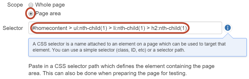Nota sobre el área de página: Cuando se selecciona la opción Área de página , el campo Selector aparece debajo del campo Ámbito, lo que le permite ingresar una ruta de selector CSS que define el elemento que contiene el área de página. Para obtener más información, consulte Proceso del Selector CSS.
