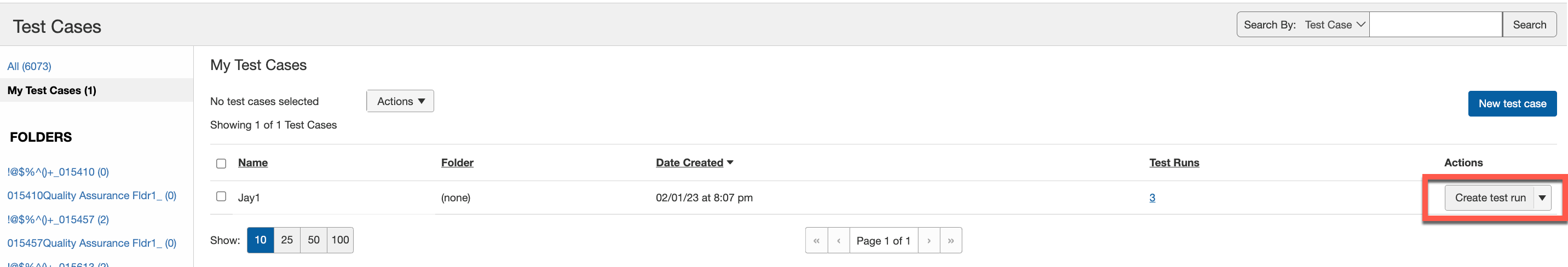 - En la pantalla Casos de prueba, haga clic en el botón Crear ejecución de prueba en la columna Acciones dentro de la fila del caso de prueba para el que desea crear una ejecución de prueba.