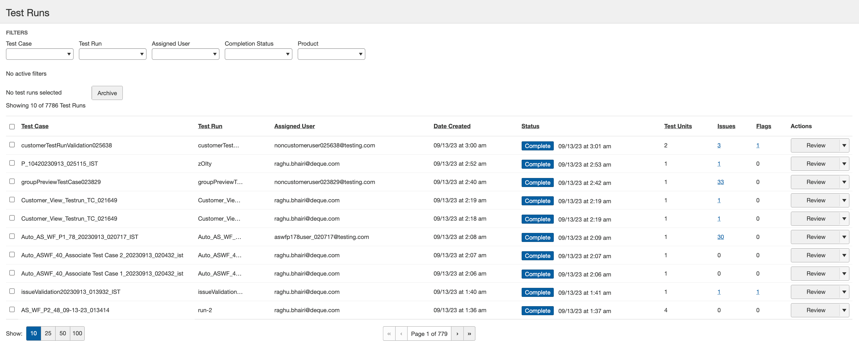 Archivar: seleccione una o más filas en las casillas de verificación de la columna izquierda y luego haga clic en un botón en la parte superior de la tabla para archivar varias ejecuciones de pruebas al mismo tiempo. Nota: Tenga cuidado al seleccionar todo; si las ejecuciones de prueba no se filtran, se seleccionarán todas y la acción de desarchivar solo la puede realizar el servicio de asistencia técnica de Deque y puede demorar un tiempo. Para obtener más información, consulte Archivar una ejecución de prueba.