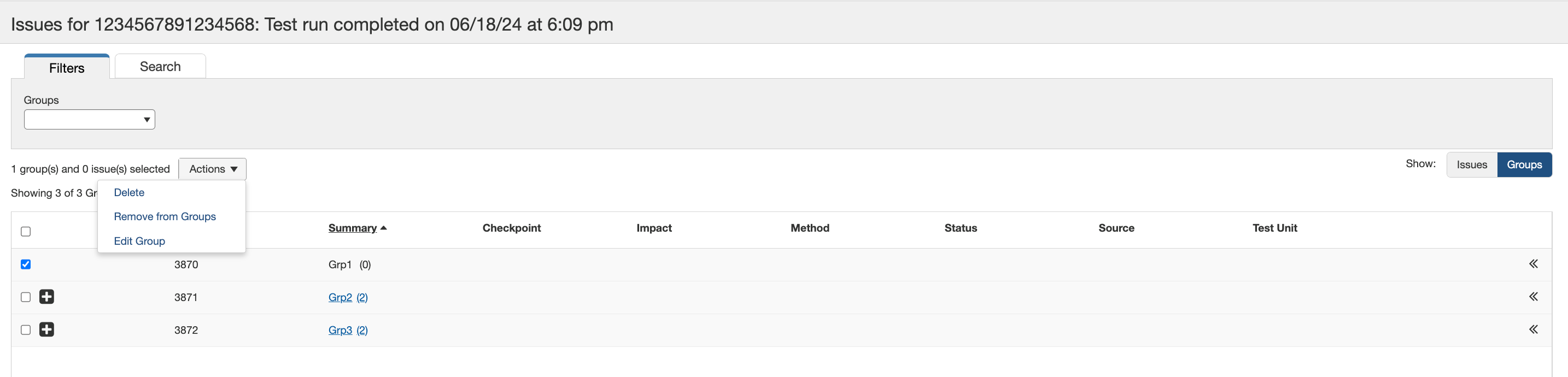 Les groupes peuvent être supprimés à l’aide de l’onglet Groupes. Pour supprimer un groupe, choisissez les groupes que vous souhaitez supprimer et sélectionnez l'option Supprimer dans le menu déroulant. Vous ne pouvez supprimer que les groupes qui ne présentent aucun incident. Si vous essayez de supprimer un groupe présentant des incidents, vous serez invité à dissocier d'abord les incidents.