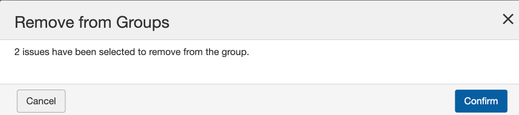Dans les deux onglets, utilisez l'option Supprimer des groupes. Une fenêtre de confirmation apparaît, indiquant le nombre de problèmes en cours de suppression d'un ou de plusieurs groupes. Cliquez sur le bouton Confirmer pour terminer la suppression des problèmes d’un ou de plusieurs groupes.