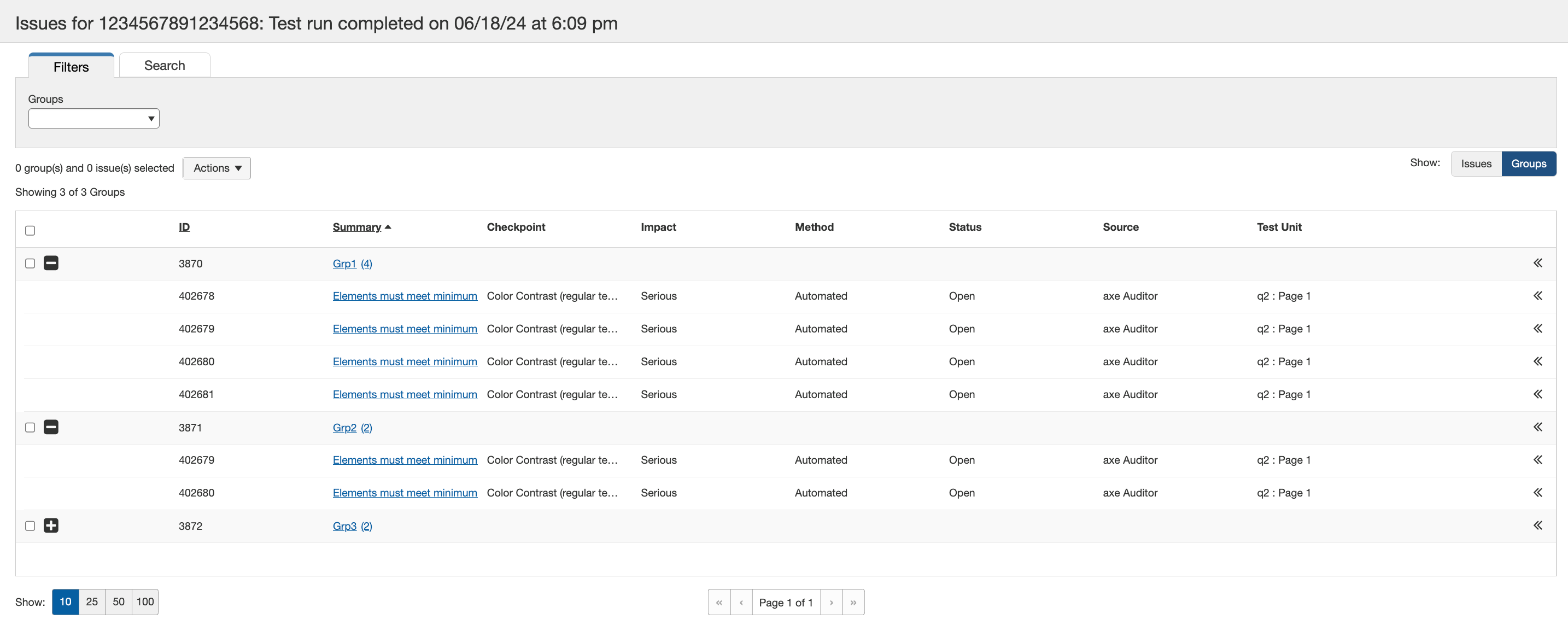 Le regroupement et la suppression d'incidents des groupes sont très simples et peuvent être effectués via le menu déroulant (voir capture d'écran ci-dessous) ou en cliquant avec le bouton droit sur des incidents individuels. Cette approche offre de la flexibilité, vous permettant de regrouper les incidents en fonction de vos processus de développement, par exemple par parcours utilisateur, composant, page ou rôle (par exemple, développeur ou concepteur).