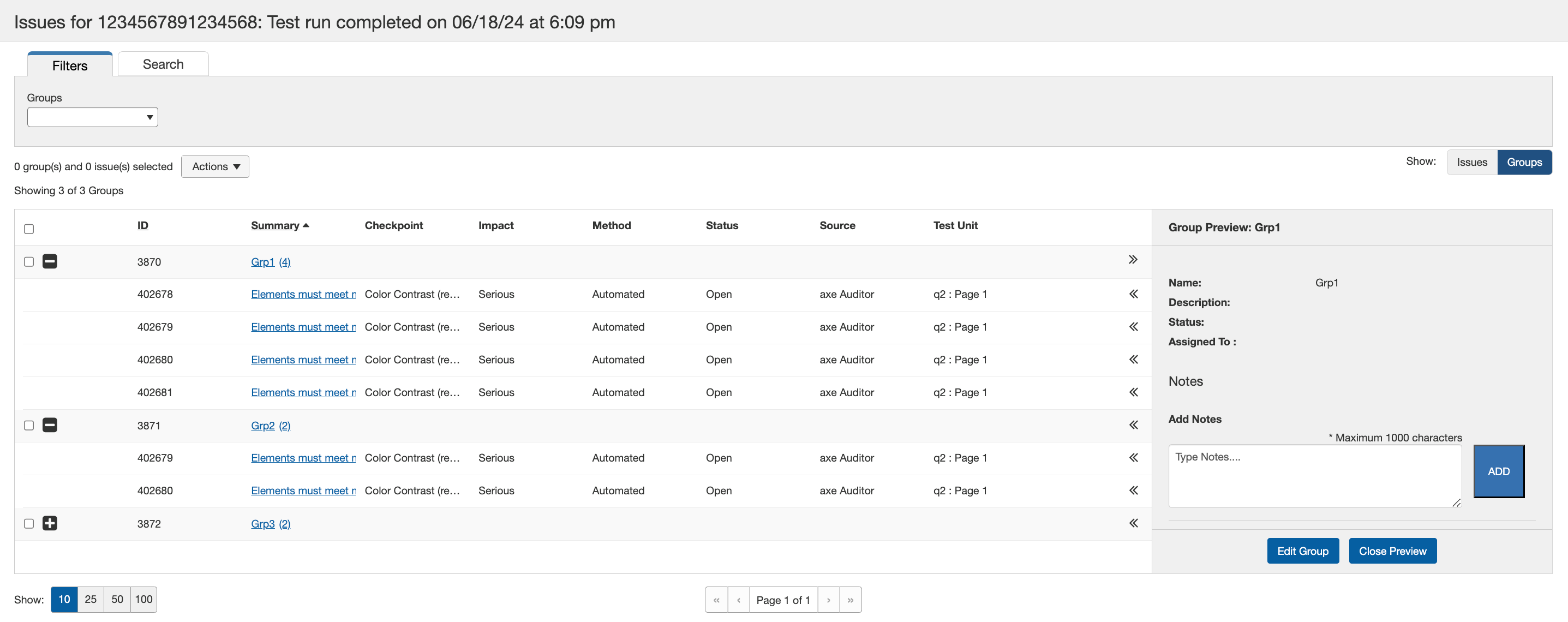 Utilisez l'option Nouveau groupe pour ajouter des incidents à un nouveau groupe. Vous pouvez inclure des détails spécifiques pour les groupes que vous créez, ce qui permet au testeur d'accessibilité de définir, d'attribuer et de gérer facilement les groupes pour la remédiation. Le seul champ obligatoire est le nom du groupe.