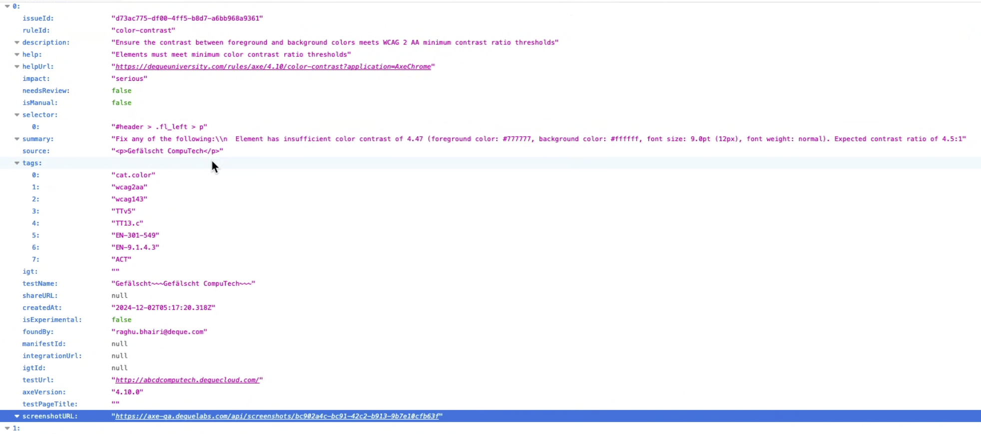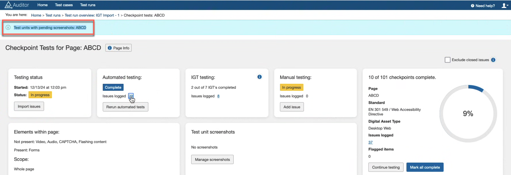 Axe Auditor permet aux utilisateurs d'importer automatiquement les problèmes manuels avec les captures d'écran associées à l'aide de la balise ScreenshotURL dans le fichier JSON. Si la balise ScreenshotURL est vide, aucune capture d'écran n'est ajoutée au problème.
