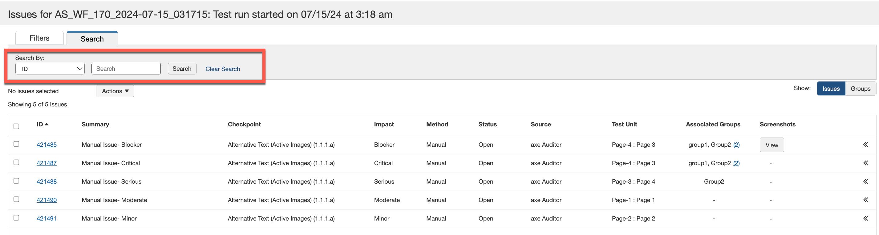 L'écran de liste des problèmes comporte un onglet Rechercher en haut du tableau que vous pouvez utiliser pour rechercher des problèmes par ID, résumé, code source, recommandation, commentaire et statut.