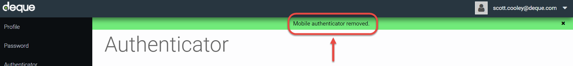 Un message de réponse système sur fond vert apparaît en haut de la page Authenticator pour vous informer de la suppression réussie.