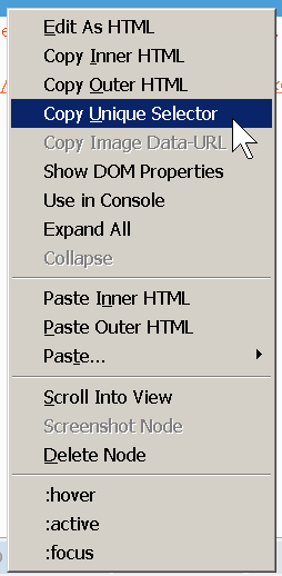 Copia il selettore CSS che desideri utilizzare come target. Ad esempio, quando si utilizzano gli Strumenti per sviluppatori di Firefox, è possibile > Copia selettore univoco ** fare clic con il pulsante destro del mouse su per l'elemento attualmente selezionato nello strumento Ispettore.** Assicurati di incollare il riferimento completo dell'elemento formattato correttamente (ad esempio, per testare l'elemento dell'attributo
