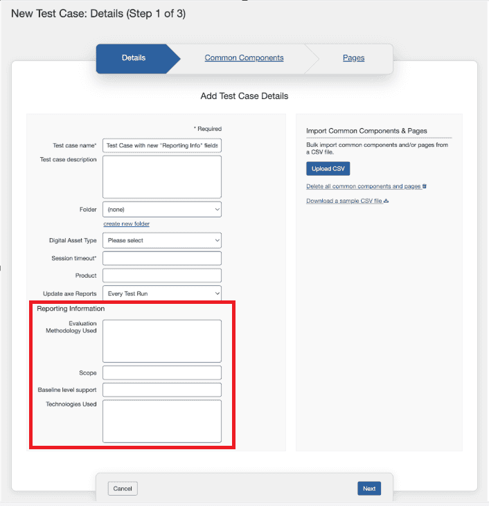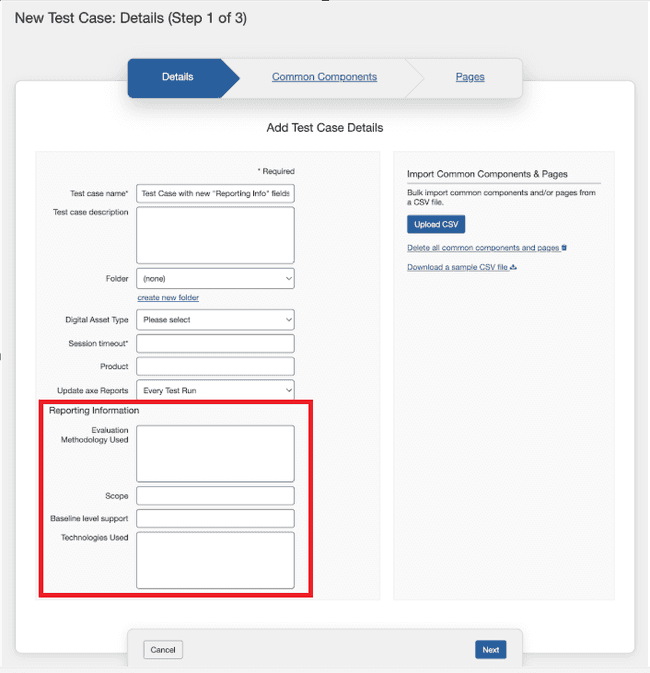 A new Reporting Information section is added to the Add Test Case Details and Create Test Runs pages. With this option, users can now include details such as the evaluation methodology used, domains, baseline level accessibility support and the technology used by the website or application while adding test case details.