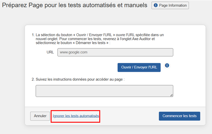 Sur l'écran Préparer la page pour les tests automatisés et manuels, activez le bouton Ouvrir/Envoyer l'URL, suivez les instructions d'accès à la page nécessaires, puis cliquez sur le bouton Démarrer le test.