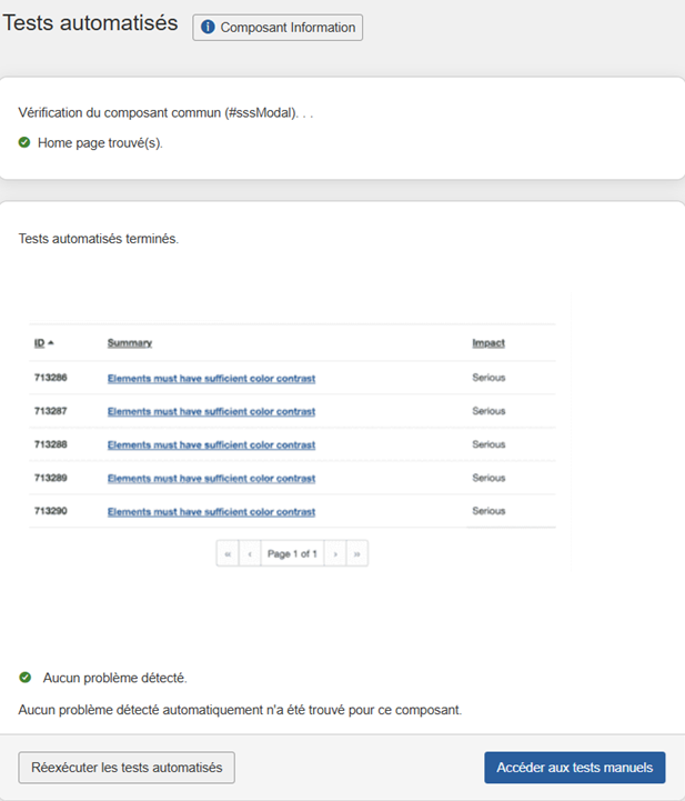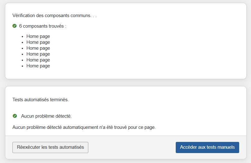 Remarque - Lorsqu'aucun problème n'est détecté : un message à cet effet s'affiche sous la forme « Aucun problème automatisé n'a été trouvé pour cette page (ou composant) ».