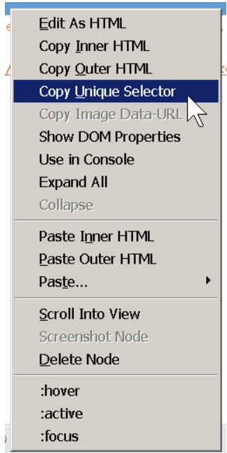 Copiez le sélecteur CSS que vous souhaitez cibler. Par exemple, lorsque vous utilisez les outils de développement Firefox, vous pouvez cliquer avec le bouton droit de la souris > Copier le sélecteur unique pour l'élément actuellement sélectionné dans l'outil Inspecteur. Assurez-vous de coller la référence d'élément complète correctement formatée (par exemple, pour tester l'élément d'attribut