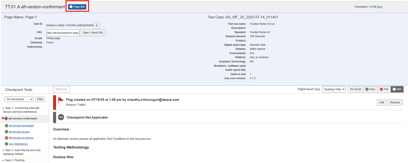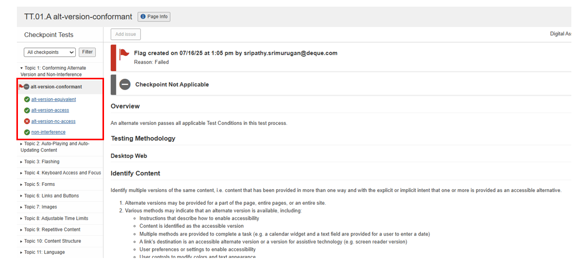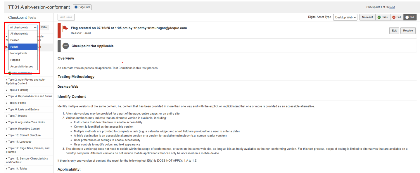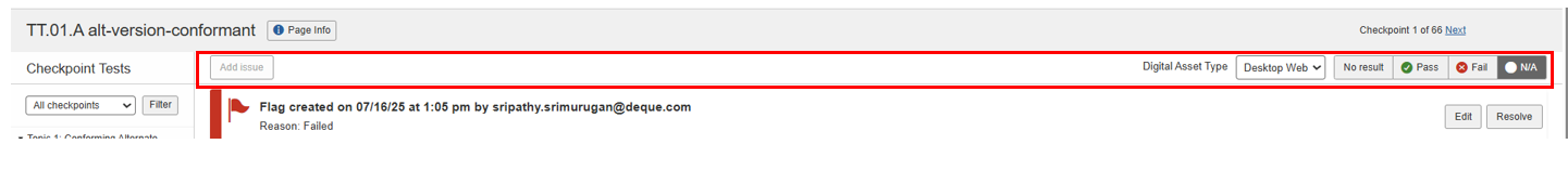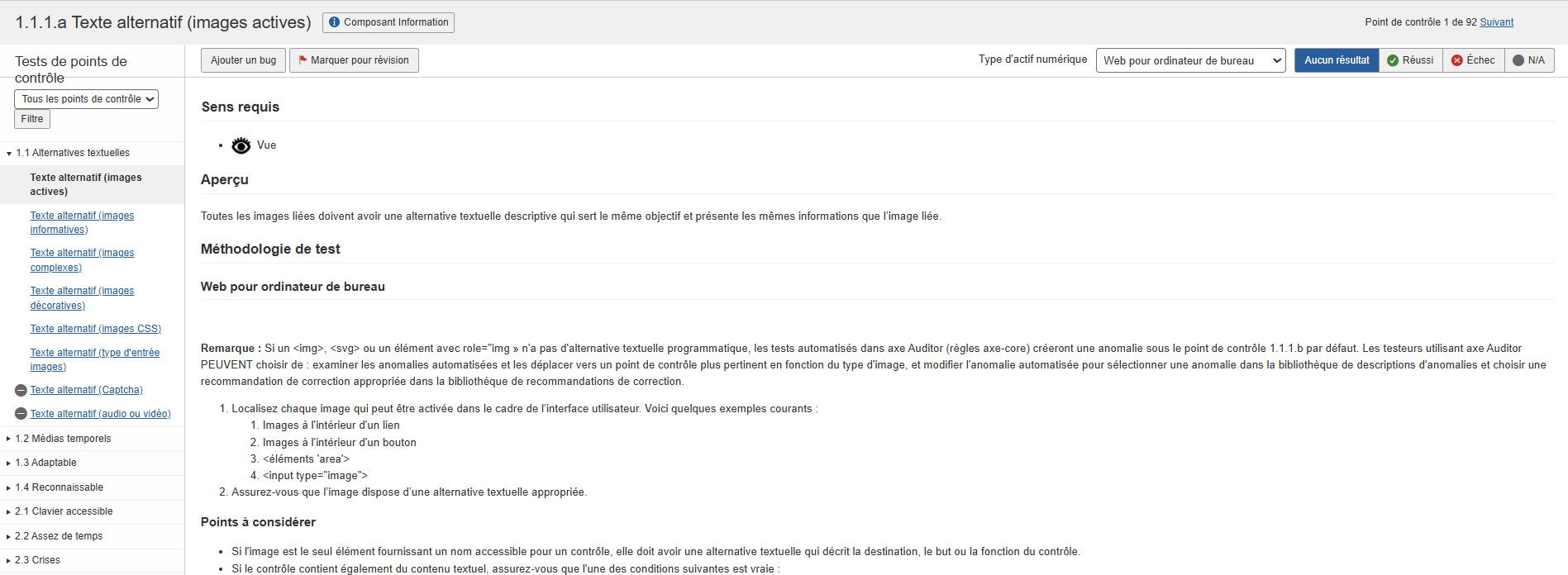 Des écrans individuels pour chaque test de point de contrôle sont utilisés pour vous guider Vous progressez à travers des tests manuels, une page de test (page en cours de test) à la fois. Suivant la méthodologie experte de Deque et le contenu associé affiché sur' Chacun de ces écrans de test augmente la cohérence du point de contrôle l'exactitude de vos résultats de tests. Peu importe l'écran de point de contrôle individuel écran de point de contrôle consulté, chacun vous fournit des outils pratiques à à gauche et en haut de la zone de contenu de la page.