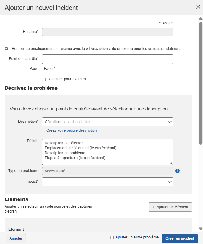 • Vous pouvez ajouter plusieurs éléments à un problème en utilisant le bouton + Add Element . Chaque problème peut comporter un maximum de 3 éléments.