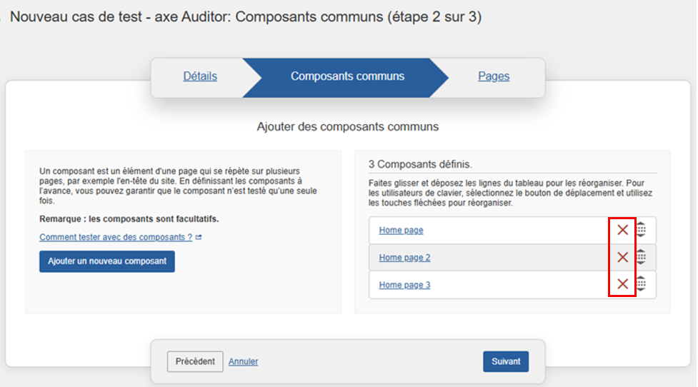 La suppression d'un composant d'un cas de test s'effectue en activant un bouton X rouge à droite du composant que vous souhaitez supprimer dans le tableau Composants définis du panneau Composants communs. # Cela peut être effectué sur un composant précédemment ajouté soit lors de la création d'un nouveau cas de test, soit lors de la modification d'un cas de test précédemment créé. Pour plus d'informations sur le chemin de départ de cette procédure, voir Création d'un nouveau cas de test ou Modification d'un cas de test.
