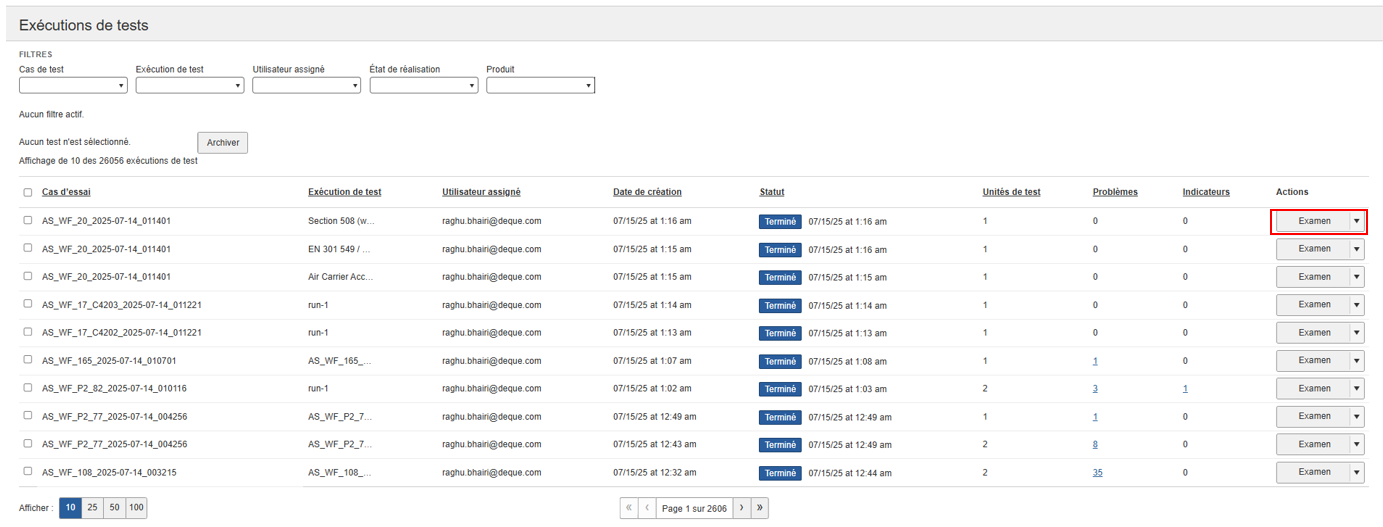 Note : Le bouton Démarrer le test n'apparaîtra dans la colonne Actions que lorsque la colonne Statut affiche l'état « Non démarré ». Cela représente généralement une nouvelle exécution de test qui a été créée et attribuée à un utilisateur, mais aucun de ses composants individuels ou pages à tester n'a encore démarré ses tests.