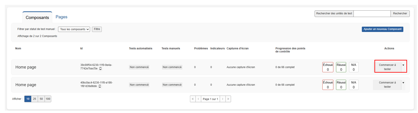 L'écran Aperçu de l'exécution du test s'affiche, affichant des sections pour chaque composant ou page à tester (sur les onglets Composants et Pages respectifs). Chacun d'entre eux dispose d'un bouton « Démarrer le test » individuel.