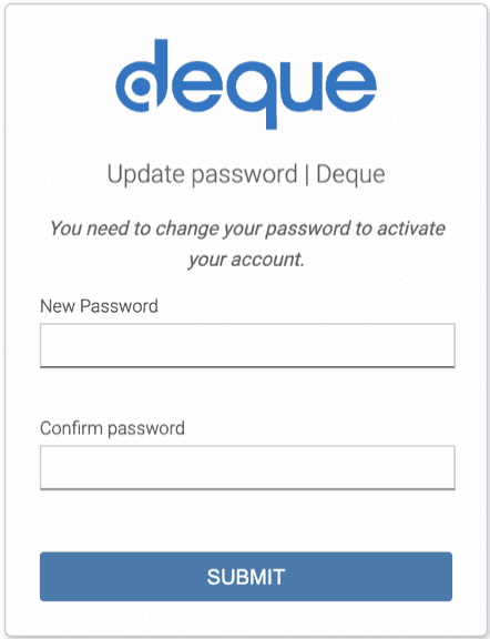 Quando l'amministratore di sistema della tua organizzazione (o in molti casi il personale amministrativo di Deque) crea un nuovo account per utilizzare axe Auditor, il tuo account verrà configurato con un nome utente e una password. Tuttavia, al primo accesso con queste credenziali, potrebbe esserti richiesto di reimpostare la password o di eseguire altre azioni. Ciò è a discrezione dell'amministratore.