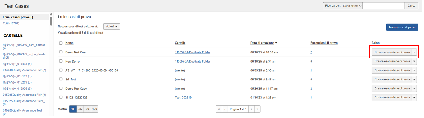 - Nella Schermata Casi di test, fare clic sul Create Test Run pulsante nella colonna Azioni all'interno della riga del caso di test per il quale si desidera creare un'esecuzione di test.