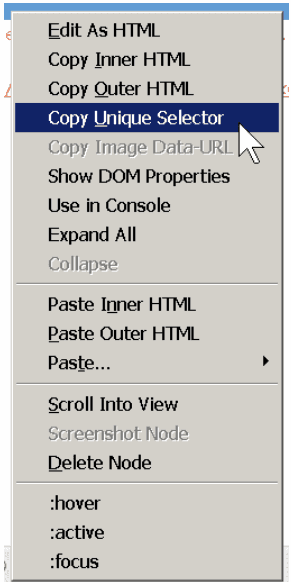 Copia il selettore CSS che desideri utilizzare come target. Ad esempio, quando si utilizzano gli Strumenti per sviluppatori di Firefox, è possibile fare clic con il pulsante destro del mouse > Copia selettore univoco per l'elemento attualmente selezionato nello strumento Ispettore. Assicurati di incollare il riferimento completo dell'elemento formattato correttamente (ad esempio, per testare l'elemento attributo