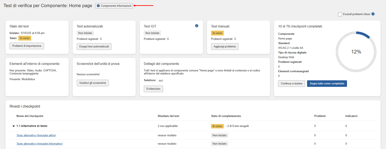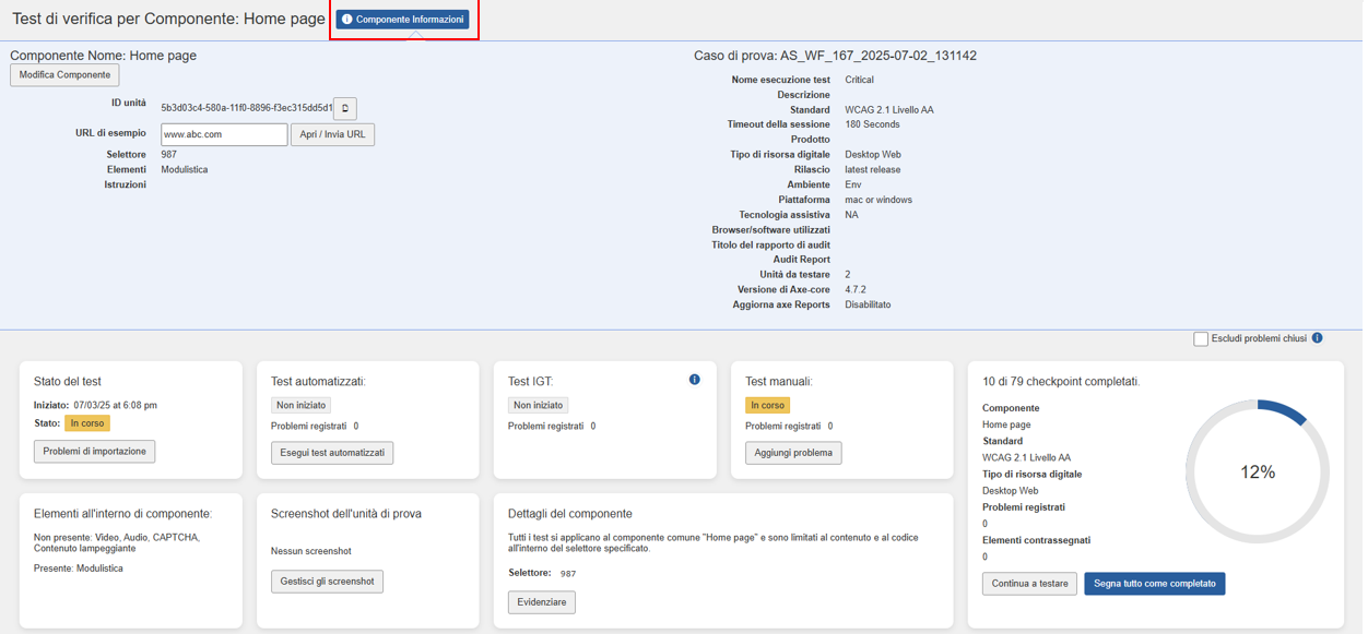 Un pulsante blu in alto a destra del pannello Componenti o Pagine consente di aggiungere nuovi elementi all'esecuzione del test (e facoltativamente al caso di test associato).