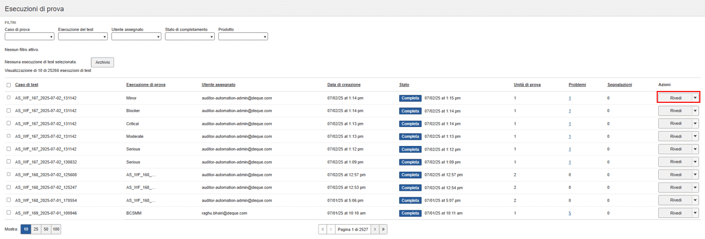 Le modifiche sono state aggiornate e si accede alla schermata Esecuzioni di test.
