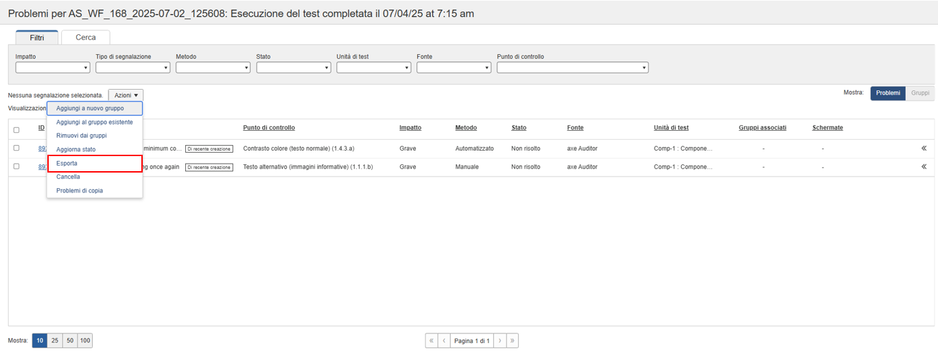 La schermata Elenco problemi fornisce una funzionalità di esportazione che viene avviata attivando il pulsante Export situato nell'opzione a discesa Azioni nella parte superiore della tabella Problemi. È possibile esportare i problemi anche se non sono stati contrassegnati come completati.