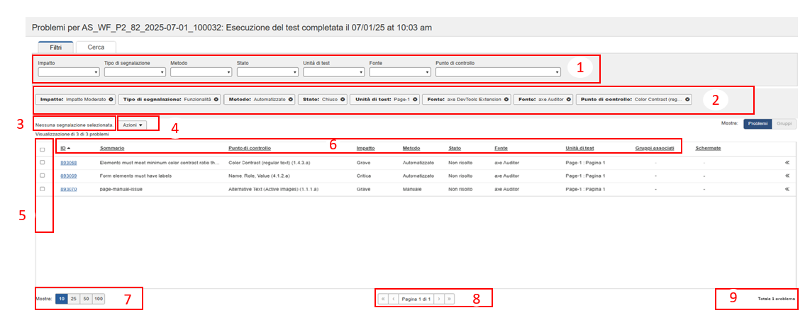 Diverse schermate dell'applicazione axe Auditor visualizzano le informazioni in un formato tabellare filtrabile e suddiviso in pagine (problemi, casi di test, esecuzioni di test, schermata iniziale, ecc.). Queste tabelle presentano caratteristiche e funzionalità comuni a più schermate, tra cui vari controlli e strumenti per il filtraggio, l'ordinamento, la selezione e la visualizzazione."global" Questo argomento elenca E ciascuno di essi fornisce istruzioni generiche per il loro utilizzo.