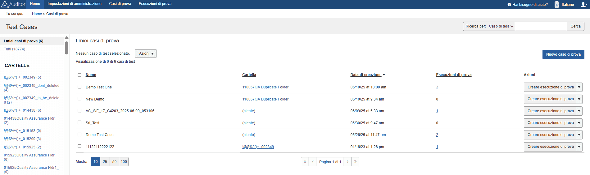 Folder link: Facendo clic su una cartella denominata o sul collegamento predefinito Cartella non organizzata, il contenuto (casi di test) viene visualizzato nella tabella nell'area principale dello schermo.