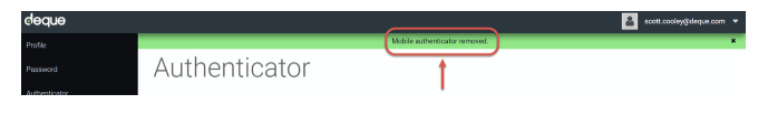 Nella parte superiore della pagina Authenticator viene visualizzato un messaggio di risposta del sistema su sfondo verde per notificare l'avvenuta rimozione.
