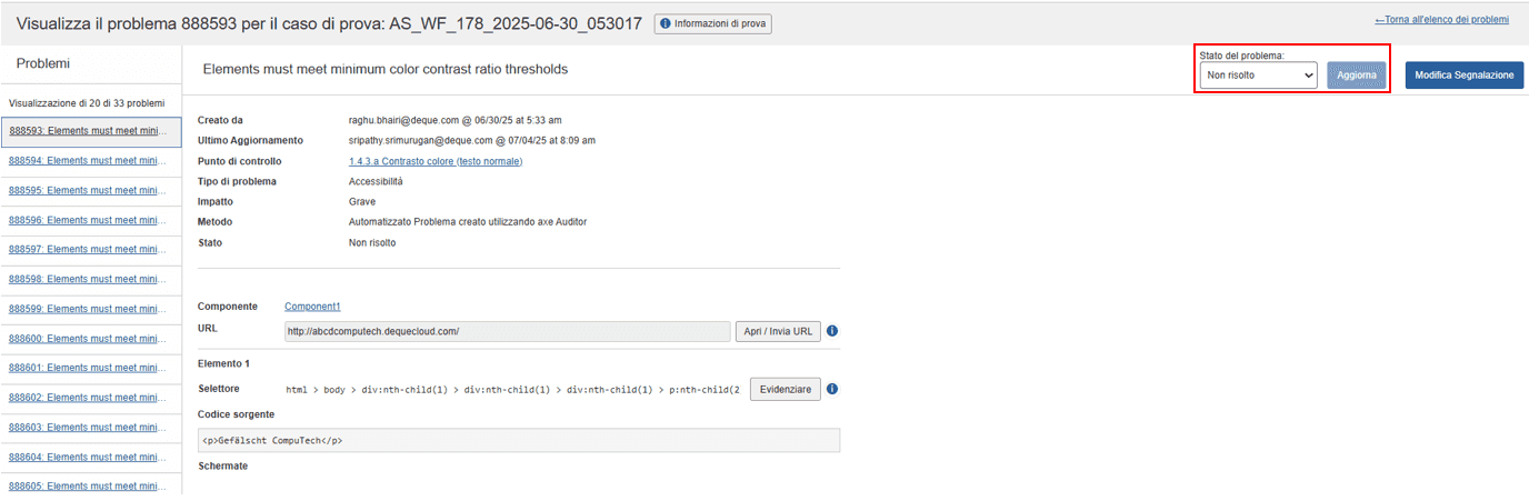 Aggiornamento dello stato dei problemi