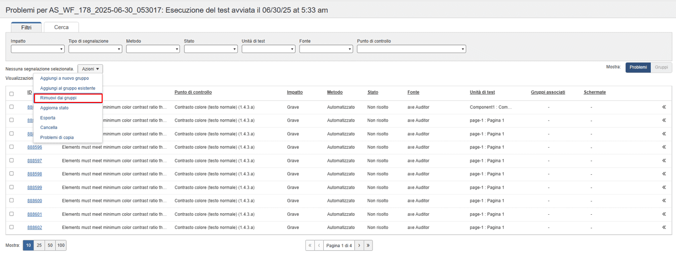 Nella pagina Esecuzioni di test, seleziona gli elementi che vuoi copiare e attiva l'opzione Copy Issues dal menu a discesa nella colonna Azioni. Puoi anche fare clic con il pulsante destro del mouse sui singoli problemi e selezionare l'opzione Copia problemi.