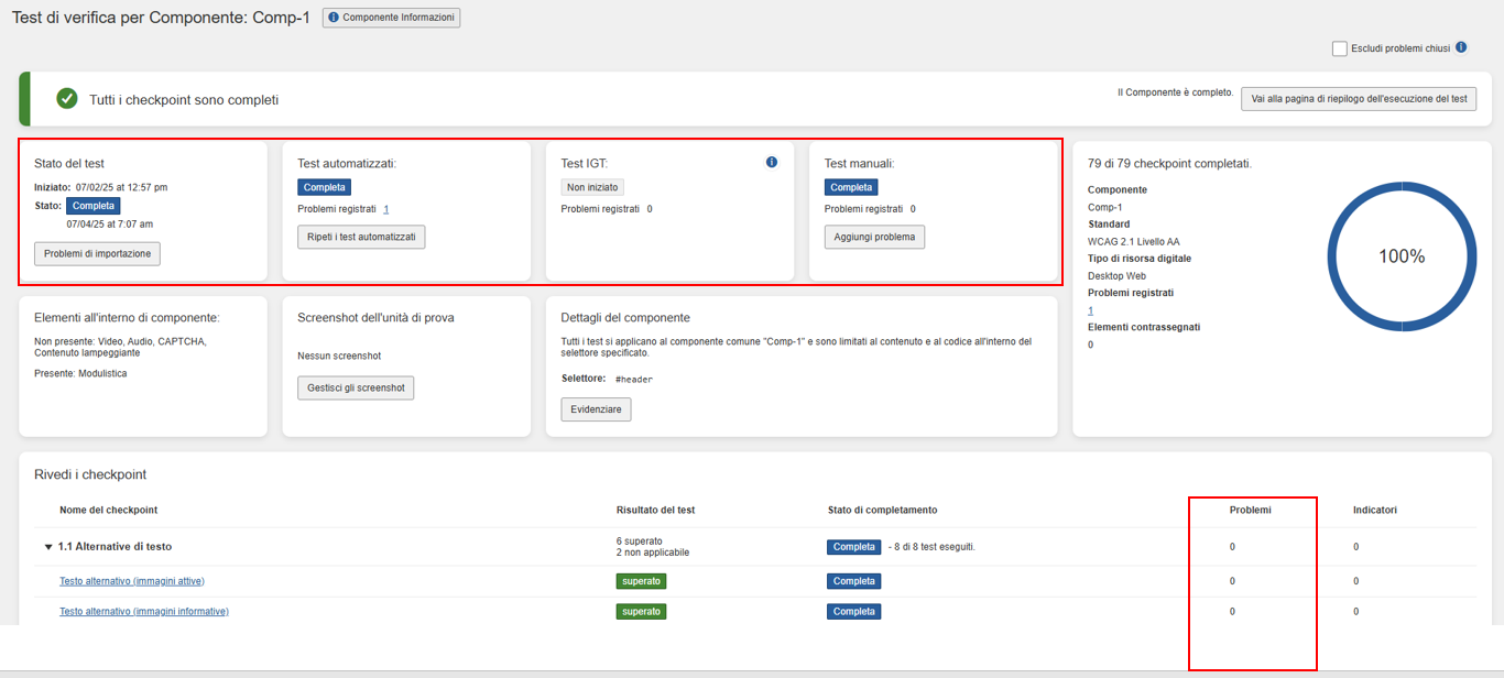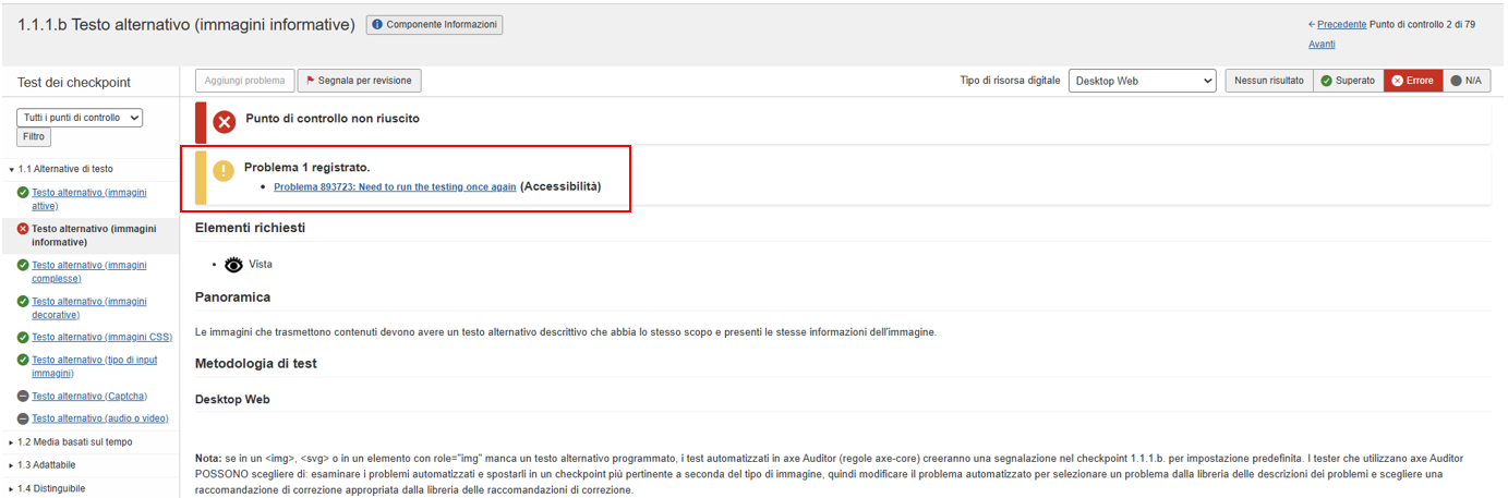 Problemi del Gruppo di Checkpoint (problemi per gruppo di checkpoint per la pagina sottoposta a test - automatizzati e manuali)