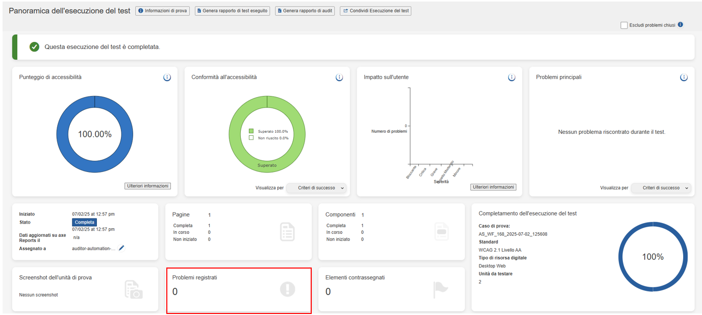 Segnalazioni automatiche (segnalazioni registrate come risultato di test automatici per la pagina sottoposta a test - tutti i checkpoint)