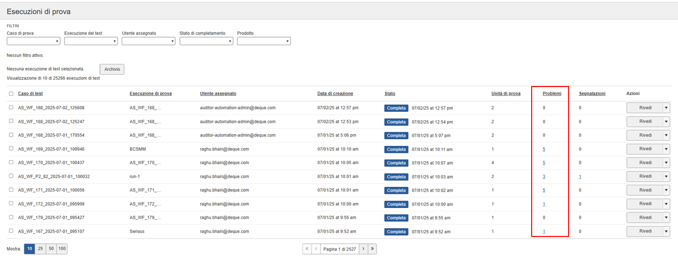 Questo argomento si riferisce all'accesso alla schermata Problemi relativi a <Test Case Name> da varie aree di axe Auditor. La schermata Problemi per <Test Case Name> fornisce una visualizzazione riepilogativa di soli cinque campi di informazioni su ciascun problema, con controlli di filtro ed esportazione. Non riguarda la visualizzazione dei dettagli dei singoli problemi nella schermata Visualizza Problema.