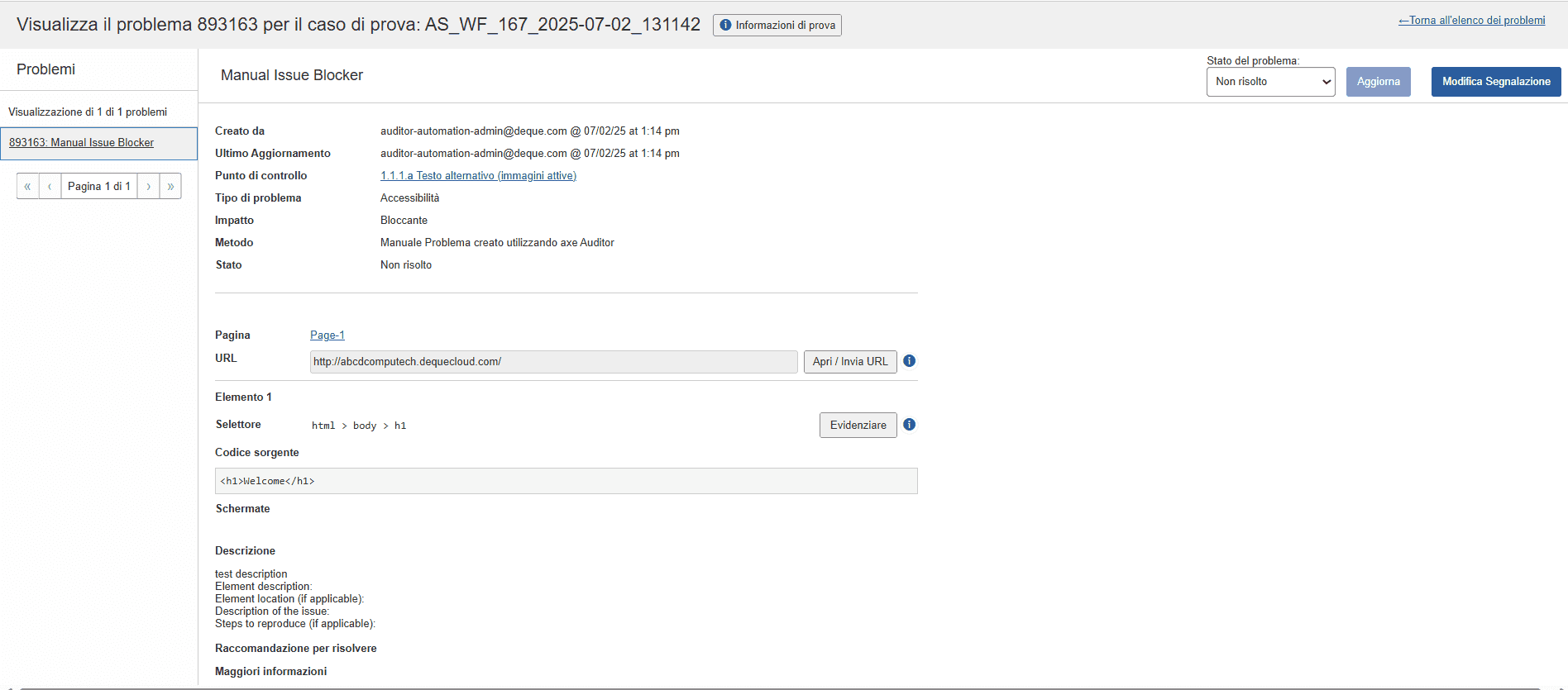 Viene visualizzata la schermata Visualizza issue <#> per caso di prova: , che mostra tutti i dettagli associati al singolo issue registrato, insieme a utili pulsanti che consentono di modificare l'issue, inviare URL ed evidenziare.