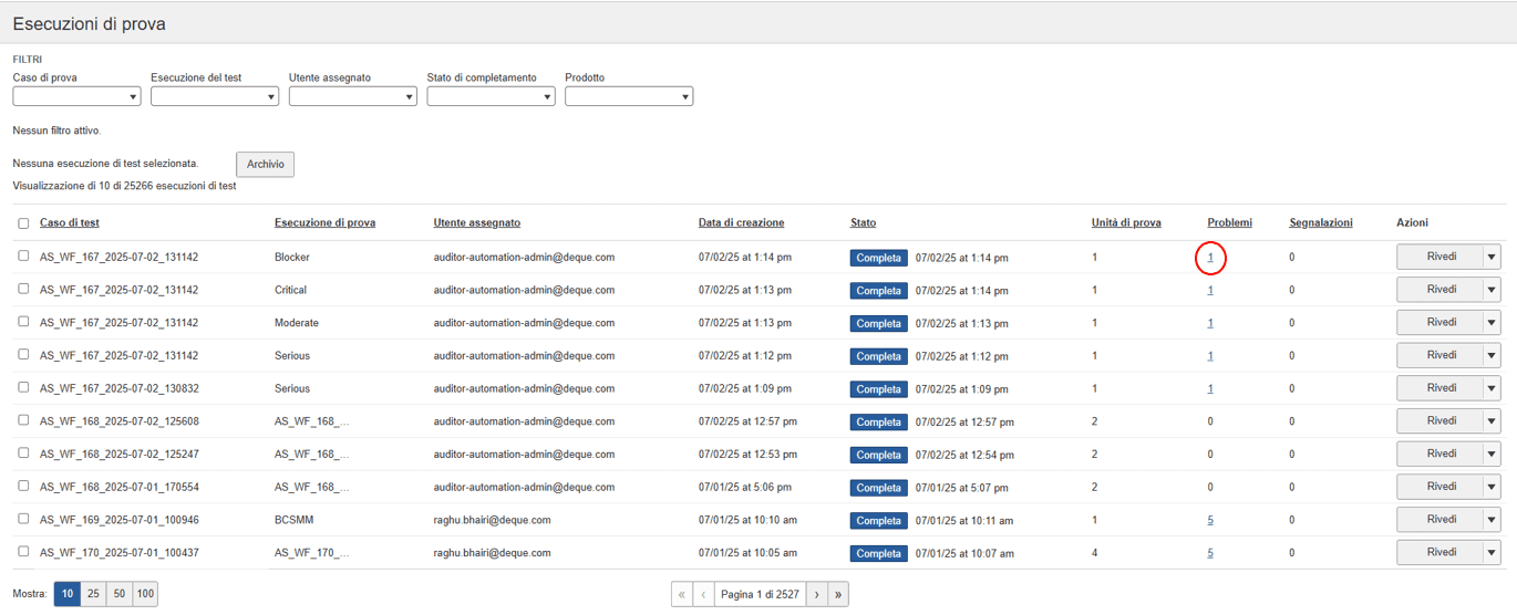 Dalla schermata Esecuzioni di test è possibile visualizzare i problemi registrati facendo clic sul collegamento # nella colonna Problemi.