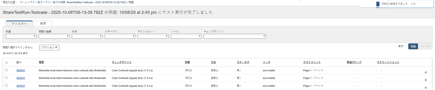 問題テーブルの左上にある「すべての問題を選択」チェックボックスの適用範囲は、現在アクセスしているテスト実行のみです。チェックボックスをチェックした結果選択された複数の問題は、現在表示しているテストランに追加されたものだけです。