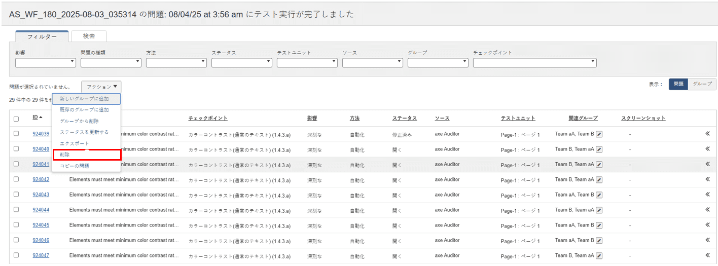 「テスト実行名の問題」画面で複数の問題を同時に削除する